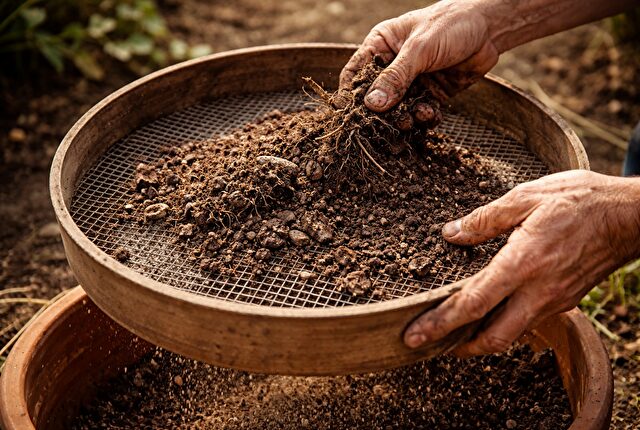 • ふるいを使う:5〜10mm目のふるいにかけると、根の残骸・石・古い肥料の塊を効率よく分離できます。