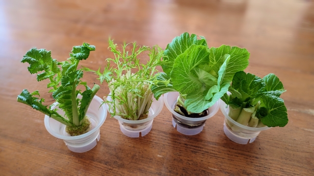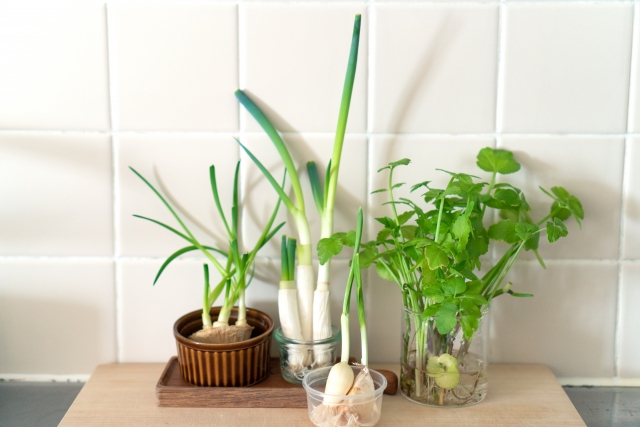 豆苗、ネギ、リーフレタスなどは、切った後の根元を水につけるだけでも再生して育ちます。ただし、長期間栽培するには栄養が不足するため、液体肥料を加えるとより健康に育てられます。リボベジ(リボーンベジタブル)としても人気です。